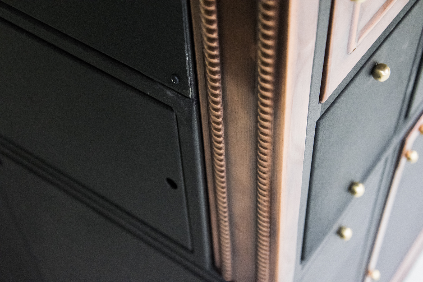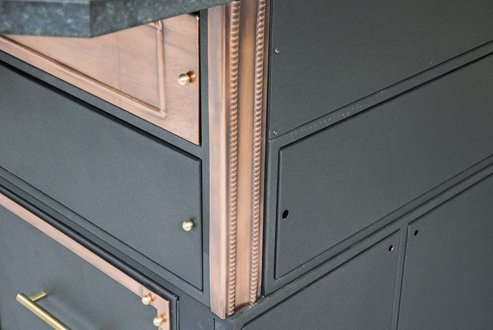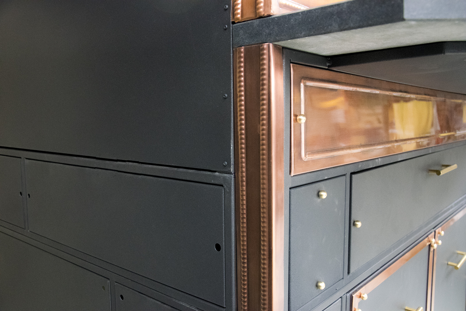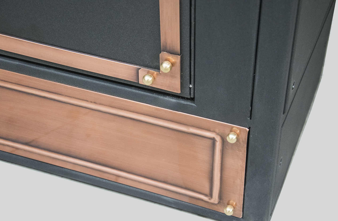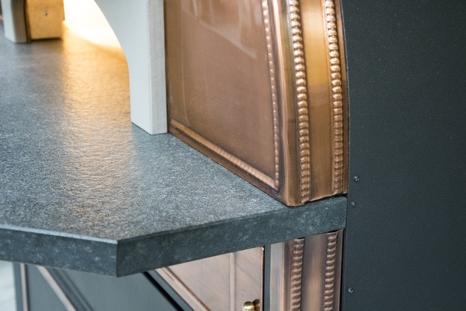Control con tarjeta electrónica de microprocesador retráctil. Frente de cobre envejecido hecho a mano. Base de cocción en ladrillo de barro de 4 cm de espesor del tipo «galleta Sorrento». Techo de la cámara de cocción en ladrillo refractario estriado de 4 cm de espesor. Resistencias en nicromo desnudo. Ruedas giratorias. Ausencia de humos de combustión. Alféizar y marco de puerta en piedra natural flameada, cepillada y antiadherente. Acabados vintage como marcos y tiradores de latón. Todo hecho con un cuidado maníaco porque este horno no solo debe ser perfecto desde el punto de vista técnico, sino que también debe ser apreciado y elegido como OBJETO DE DECORACIÓN.